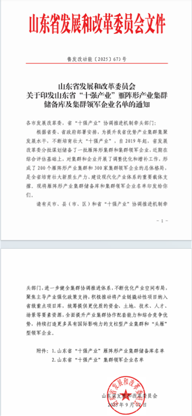 近日,省發(fā)展改革委組織開展了2025年度省“十強(qiáng)產(chǎn)業(yè)”雁陣形產(chǎn)業(yè)集群及集群領(lǐng)軍企業(yè)評選工作,經(jīng)行業(yè)評價、專家評審、綜合論證等程序,研究確定了擬增補(bǔ)雁陣形產(chǎn)業(yè)集群28個,集群領(lǐng)軍企業(yè)27家。公司憑借在行業(yè)中的顯著優(yōu)勢和綜合實力,成功入選山東省“十強(qiáng)產(chǎn)業(yè)”集群領(lǐng)軍企業(yè)。